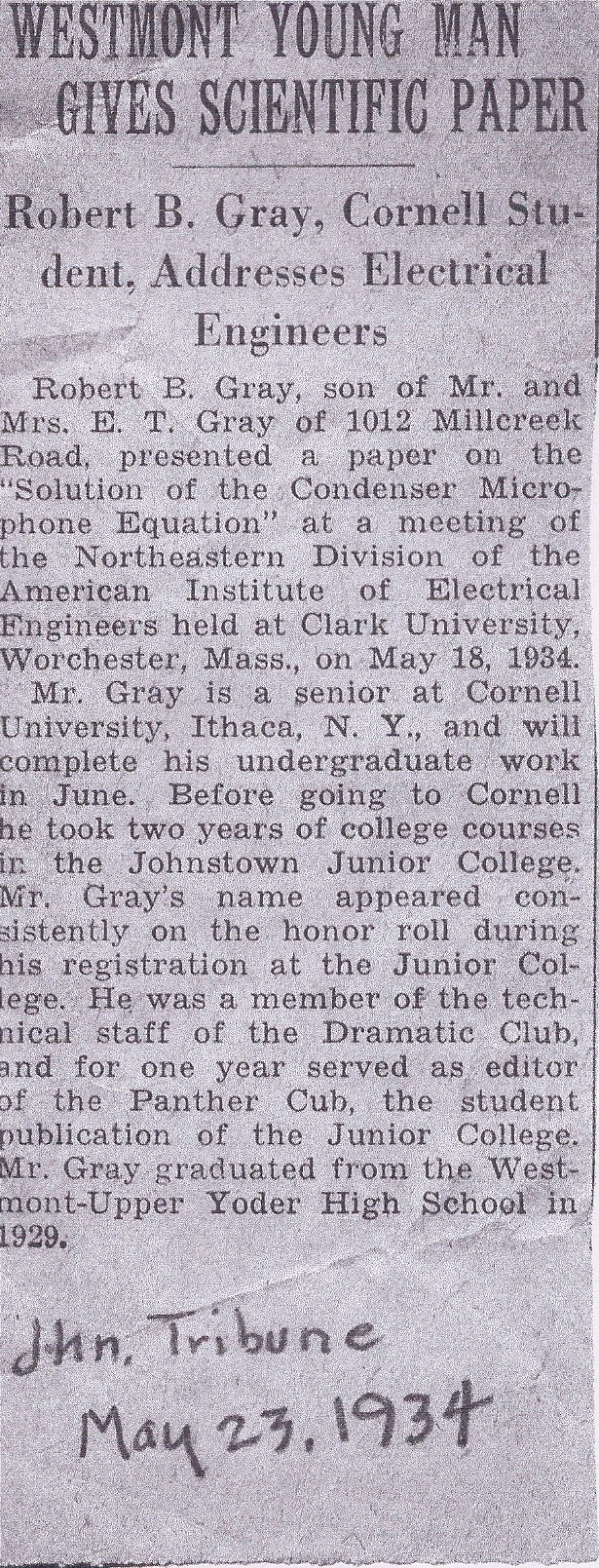 • Education: Johnstown Tribune, 23 May 1934, Johnstown, Cambria, Pennsylvania. Presented paper. Senior at Cornell University. Attended Johnstown Community College for two years prior to Cornell.