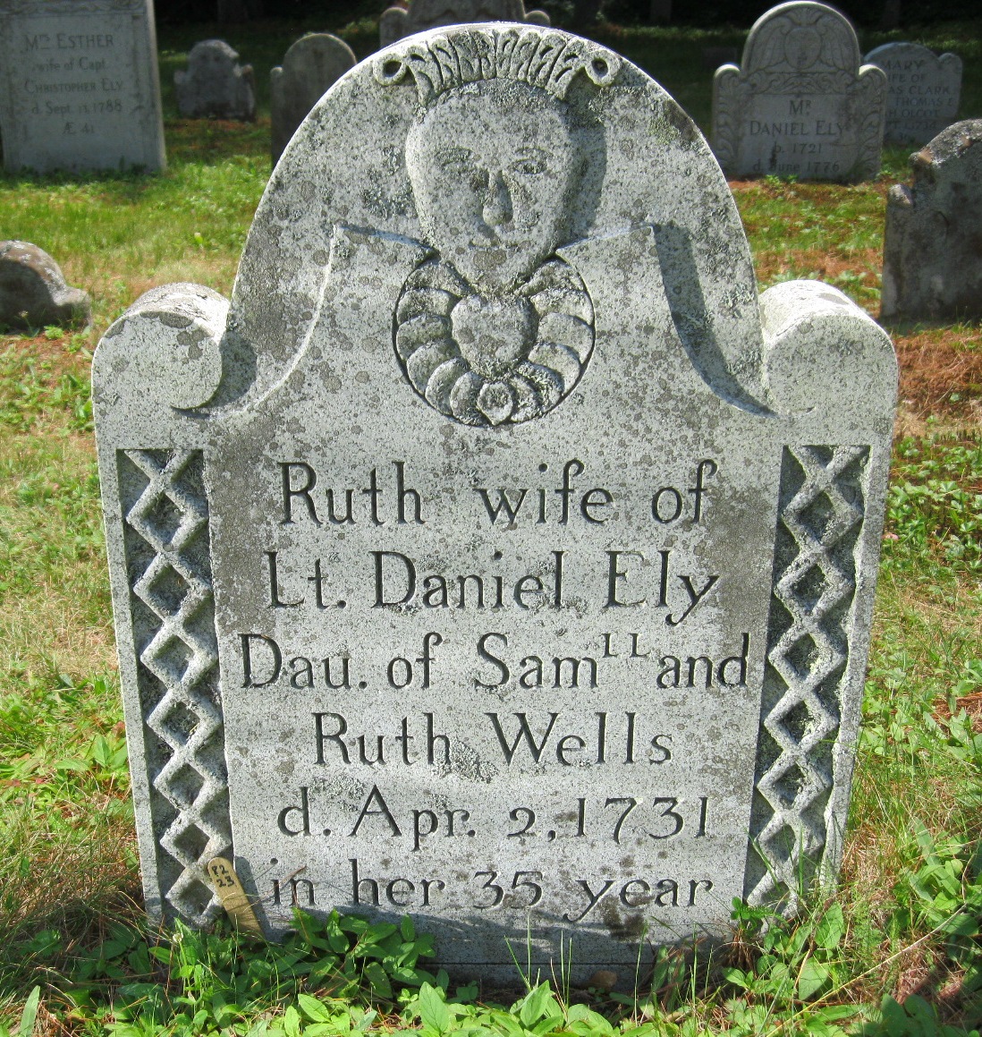 Inscription: Ruth wife of Lt. Daniel Ely Dau. of Sam and Ruth Wells d. Apr: 2 1731, in her 35 year