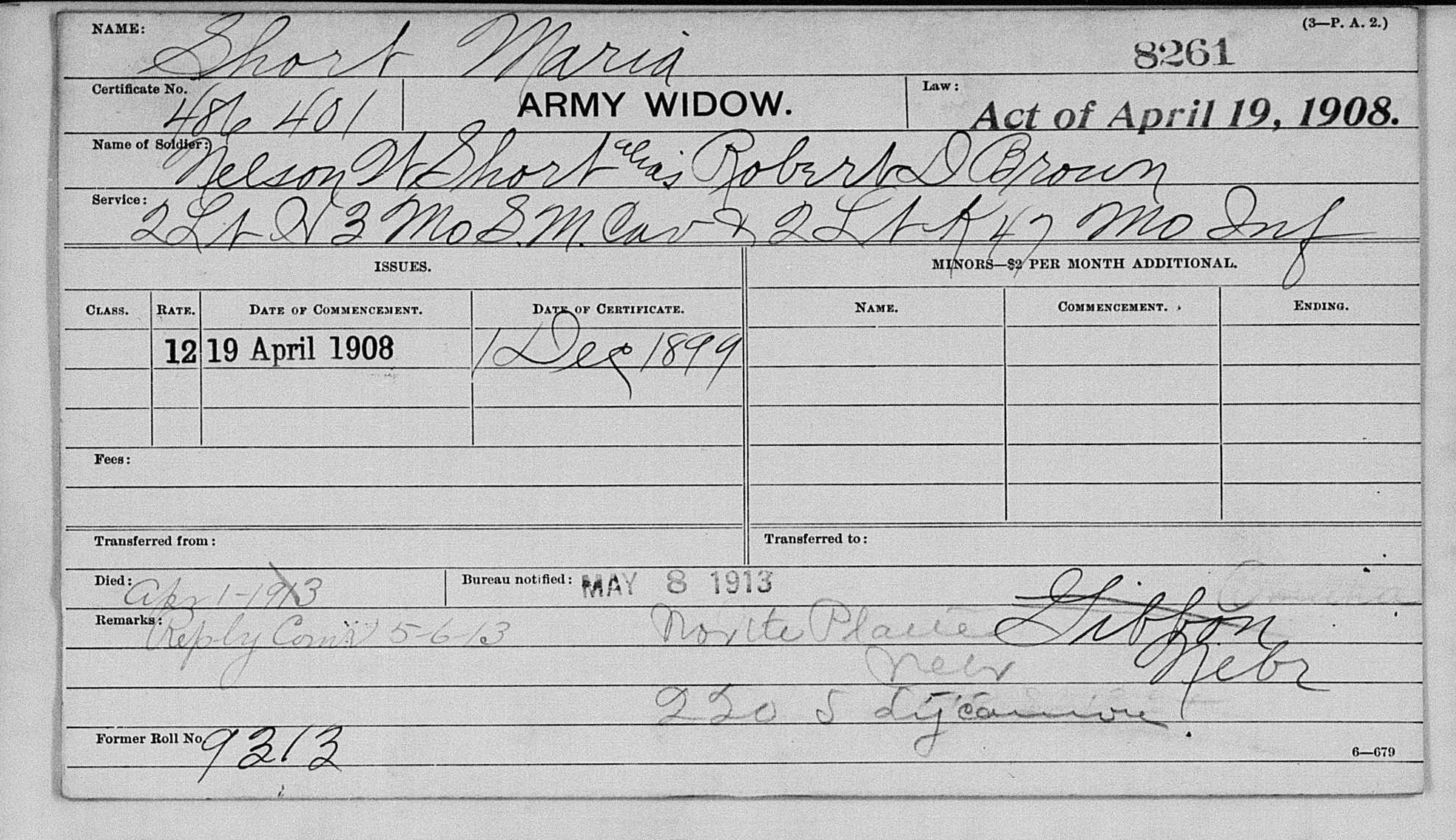 • Pension: From Family Search org, 1912, Gibbon, Buffalo, Nebraska. • Death: Family Search Org Ancestral File Record. FamilySearch™ Ancestral File v4.19 • Cemetery: From Find a Grave, 1913, Gibbon, Buffalo, Nebraska. Mariah Short Maria married Nelson William Short, son of Unknown and Unknown, on 3 Aug 1856 in Sandusky, Ohio. (Nelson William Short was born on 13 Mar 1834 in Ballville, Sandusky, Ohio, died on 4 Mar 1898 in Gibbon, Buffalo, Nebraska and was buried in Gibbon, Buffalo, Nebraska.)